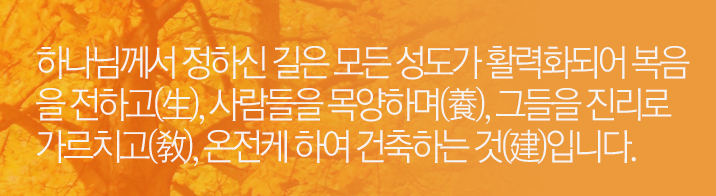 하나님께서 정하신 길을 실행하는 우리는 반드시 한 마음 한뜻이어야 합니다. 또한 지속적으로 확고부동하게 계속해서 실행해야 합니다(행 2:46, 6:4). 규칙적으로 정상적이고 합당한 스케줄 안에서 계속해야 합니다. 현 시대의 완전한 이상을 좇아서 모든 힘이 다 소진될 정도로 철저히 해야 합니다(딤전 4:6, 롬 16:4, 행 15:26).
