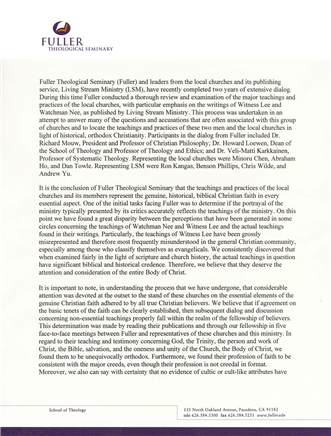 이러한 과정 안에서, 국내외 세계적인 신학자들을 배출한 미국의 풀러 신학대학은 2006년 1월 지방 교회들에 대한 성명서를 발표했습니다.