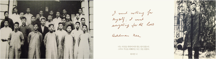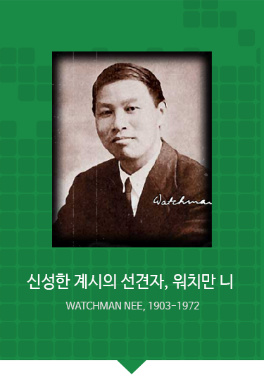 그리스도 예수의 신실한 종 워치만 니는 태어나기 전부터 주님께 헌신되었습니다. 아들을 바라며 그의 어머니는 주님께 “나에게 사내아이를 주신다면 내가 그를 당신께 드리겠습니다.”라고 기도했습니다. 그 후 오래지 않아 1903년 워치만 니가 중국의 복주(Foochow)에서 2세대 그리스도 부모 밑에서 태어났습니다. 그는 아주 총명했을 뿐 아니라 비범한 학생이어서 초등학교부터 대학교까지 반에서 뿐 아니라 전교에서 일등을 했습니다. 어릴 적부터 워치만 니는 복음을 알았지만 그가 구원을 위해 예수님을 그의 주님으로 영접한다면 그가 반드시 그분을 절대적으로 섬겨야 한다는 깊은 깨달음과 확신이 있었습니다. 1920년 열 일곱살때 그는 주님을 일생을 다해 섬긴다는 조망을 갖고 구원받았습니다.