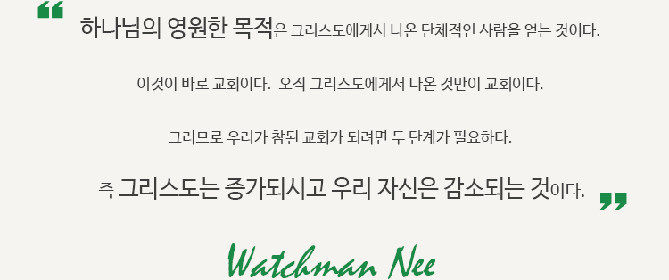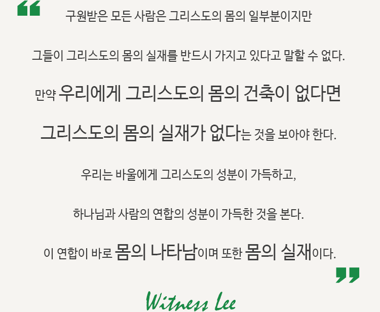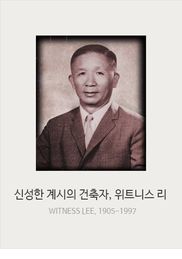 주님께서 그분의 교회를 건축하기 위해 일찍이 사도들을 통하여 그리스도를 사역했던 것과 같이, 주님은 워치만 니와 위트니스 리를 오늘날 크게 사용하셨습니다. 그들은 그리스도의 몸을 건축하는 신약의 사역을 지속하는데 있어서 신실했습니다. 워치만 니는 참으로 금세기에 있어서 신성한 계시의 선견자였으며, 위트니스 리는 이 시대 안에서 동일한 신성한 계시를 따라 그리스도의 몸을 건축하는데 있어서 확실히 능숙한 건축가로서 지혜로운 사람이었습니다.